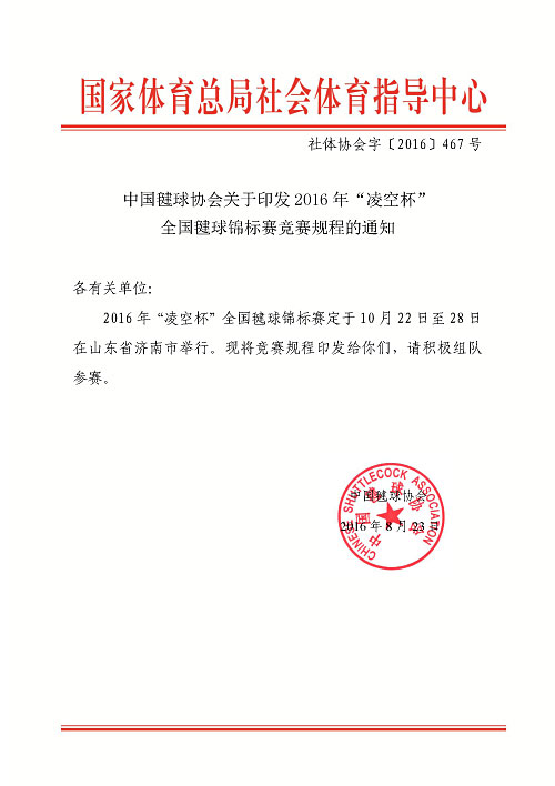 关于印发2016年“凌空杯”全国毽球锦标赛竞赛规程的通知