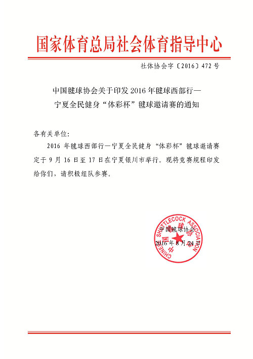 关于印发2016年毽球西部行——宁夏全民健身“体彩杯”毽球邀请赛的通知