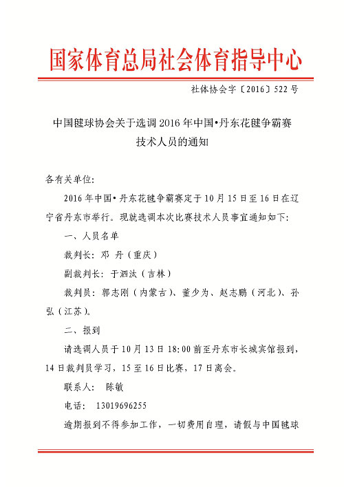 关于选调2016年中国·丹东花毽争霸赛技术人员的通知