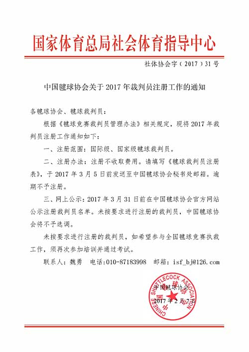 关于2017年裁判员注册工作的通知