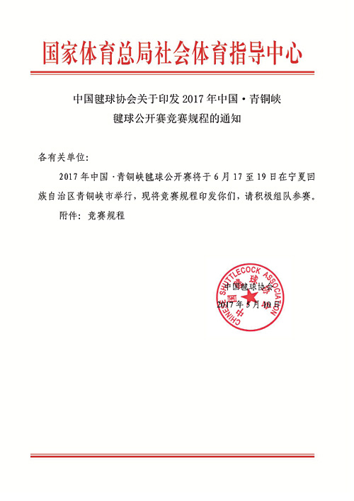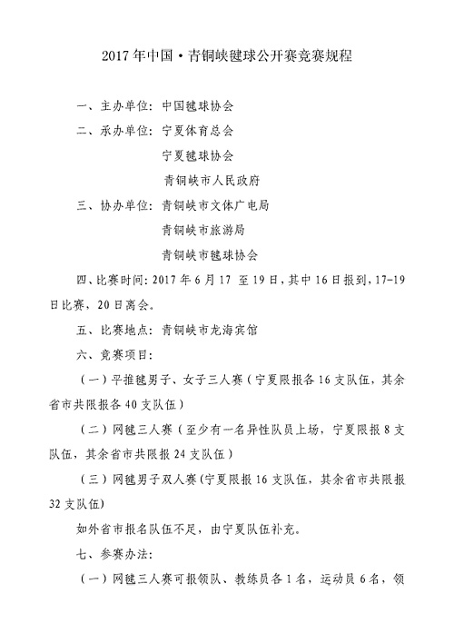 中国毽球协会关于印发 2017 年中国·青铜峡毽球公开赛竞赛规程的通知