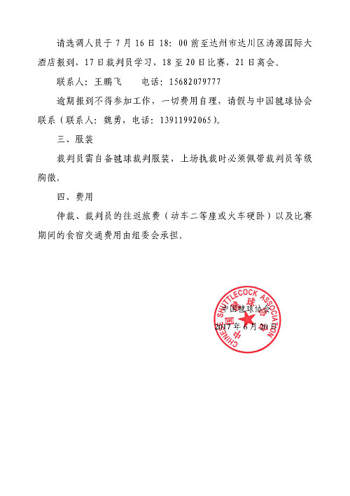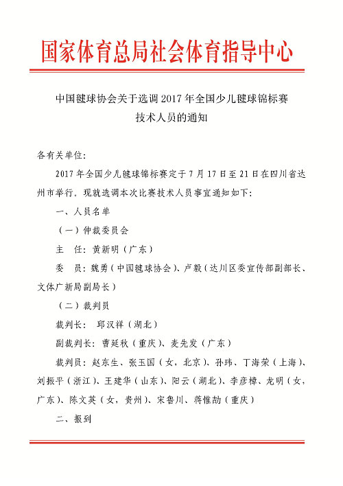 关于选调2017年全国少儿毽球锦标赛技术人员的通知