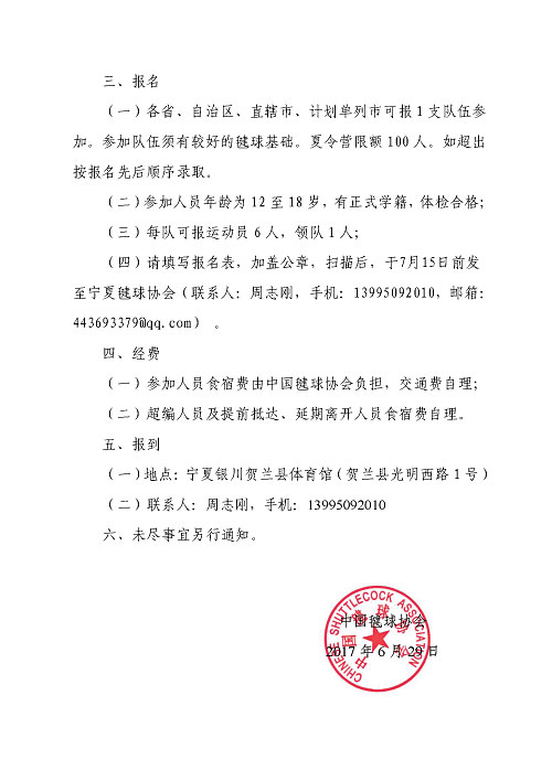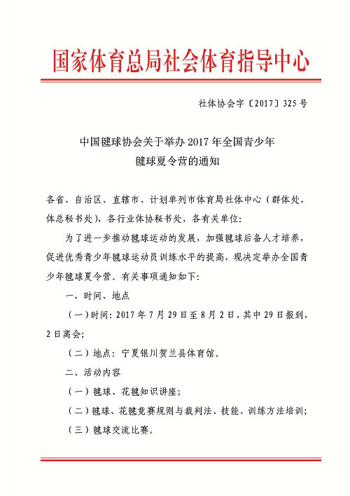 关于举办2017年全国青少年毽球夏令营的通知