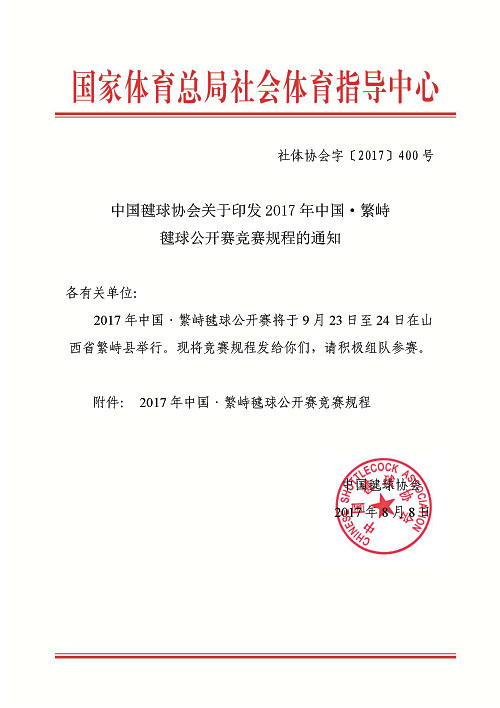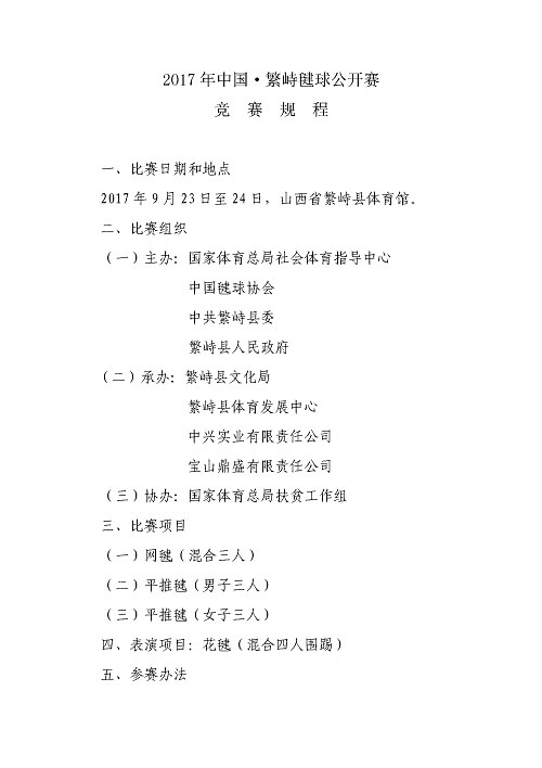 关于印发2017年中国·繁峙毽球公开赛竞赛规程的通知