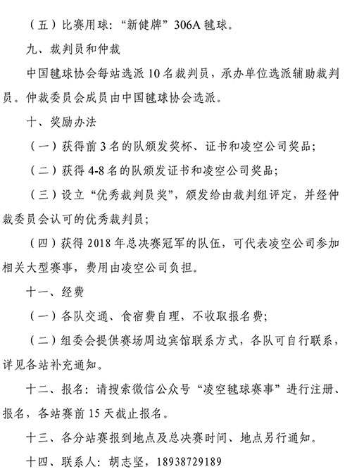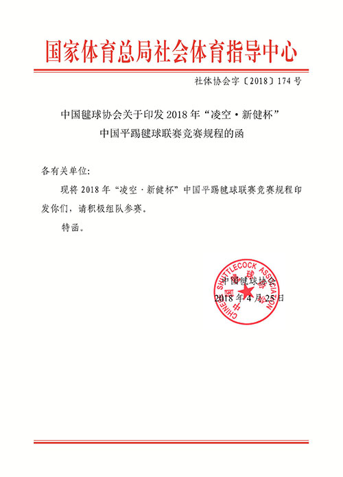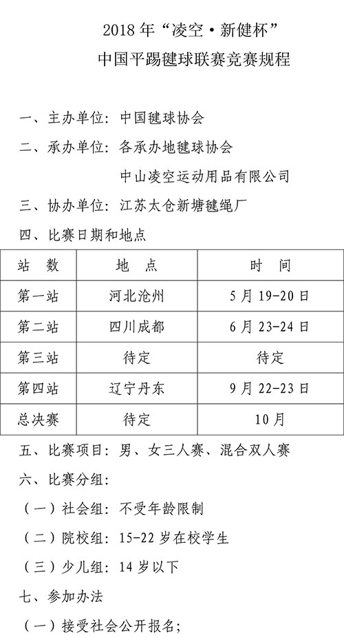 关于印发2018年“凌空·新健杯”中国平踢毽球联赛竞赛规程的函